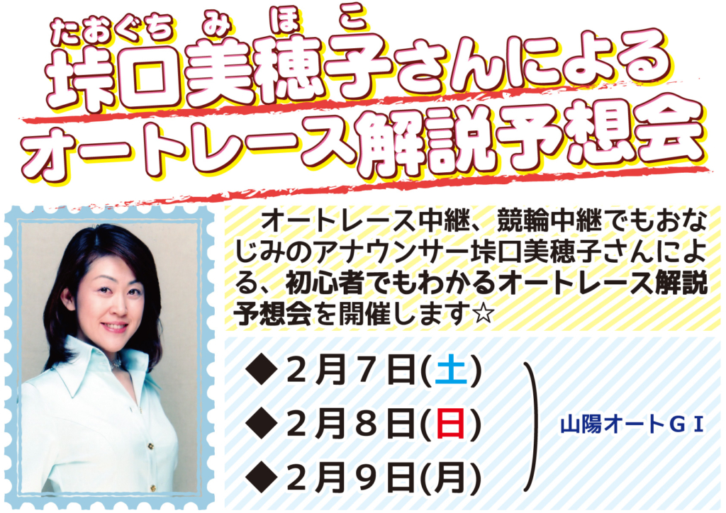 垰口美穂子さんの「初心者でもわかるオートレース解説予想会」2月開催日
